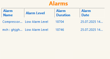 Client Ekranında Editör arayüzünde oluşturulan alarmlar tetiklendiğinde, Alarms (Alarmlar) bölümünde görünür.